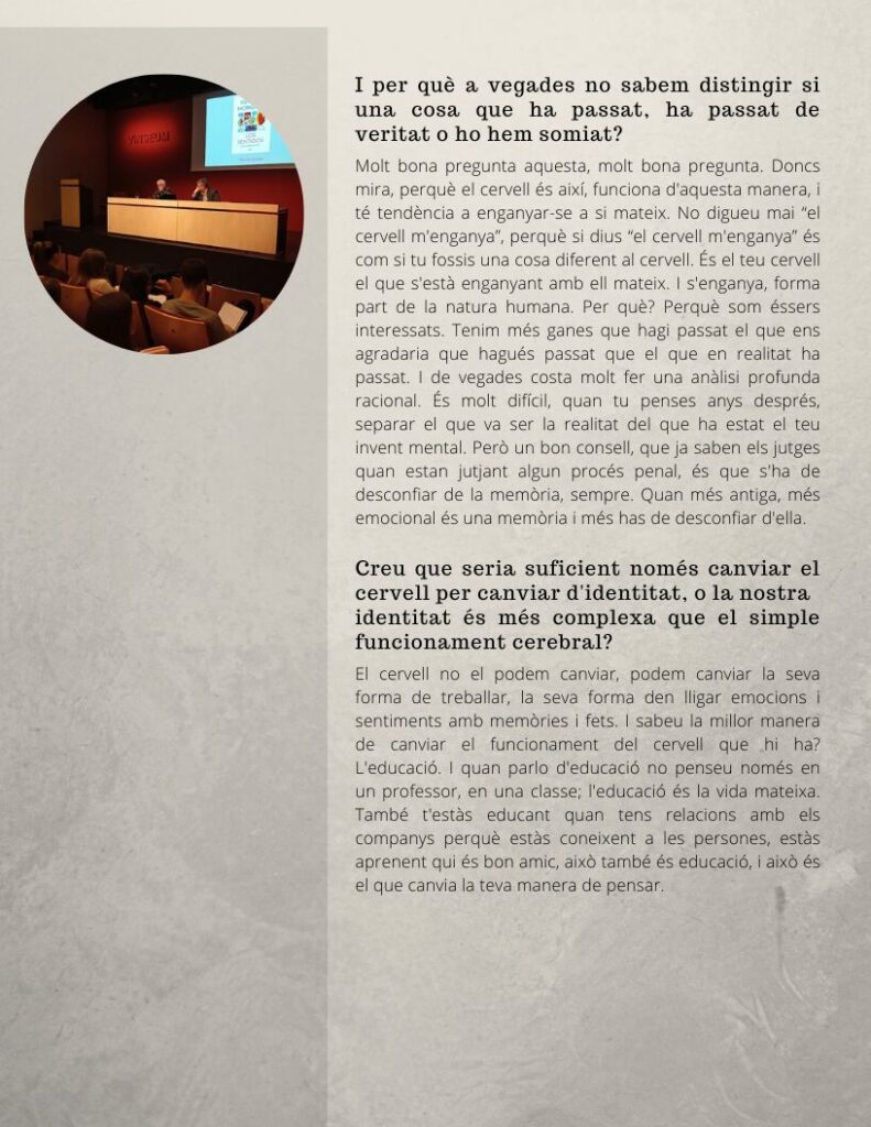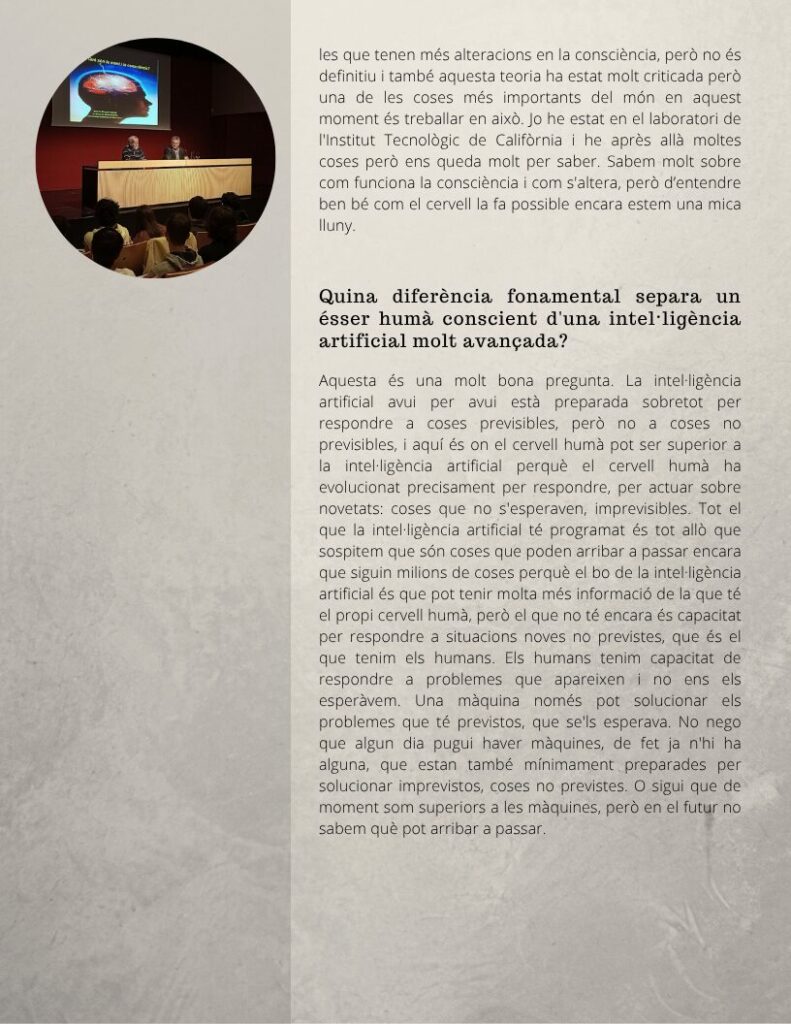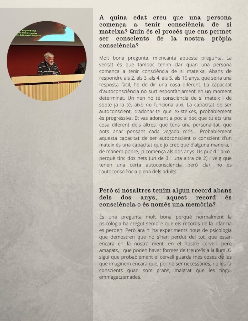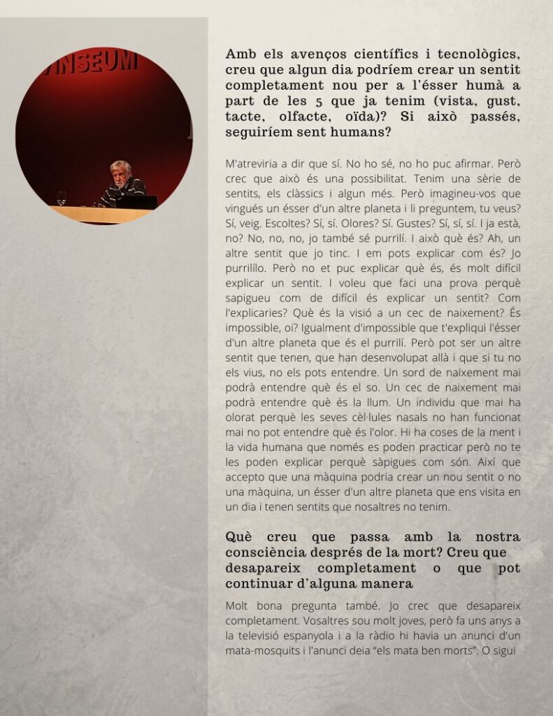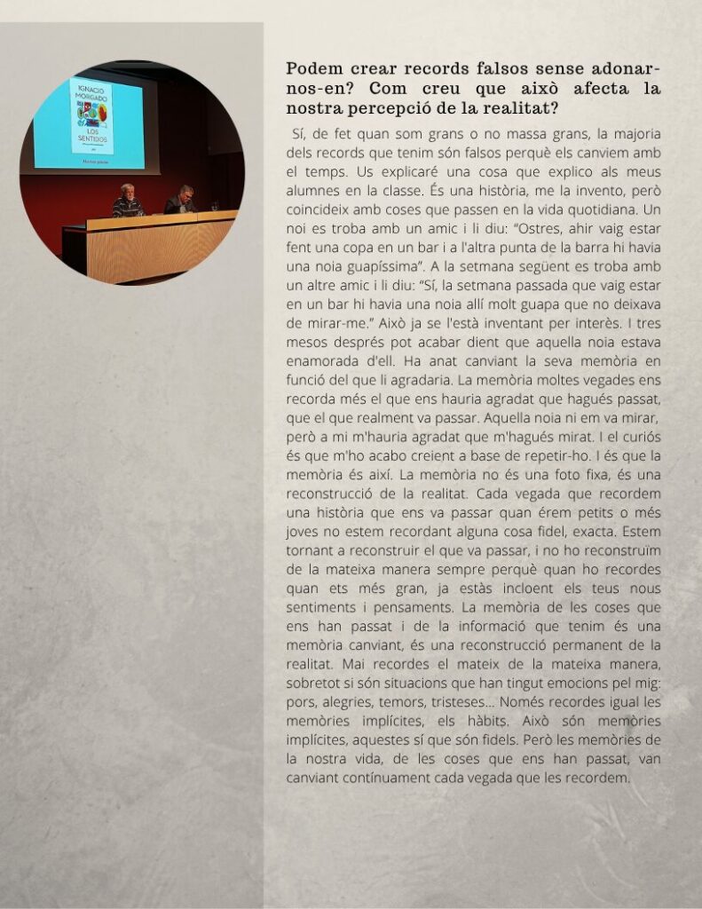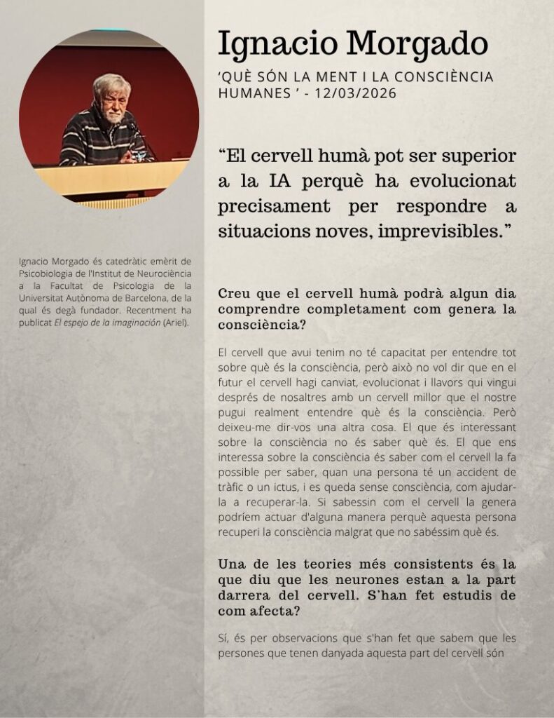 Oferim, a continuació, l’entrevista amb Ignacio Morgado, catedràtic emèrit de Psicobiologia a la Facultat de Psicologia de la Universitat Autònoma de Barcelona. L’entrevista va tenir lloc el passat 12 de març i ha estat realitzada per la Nawar Hossain i la Paula Zou, alumnes de 2n de Batxillerat.
