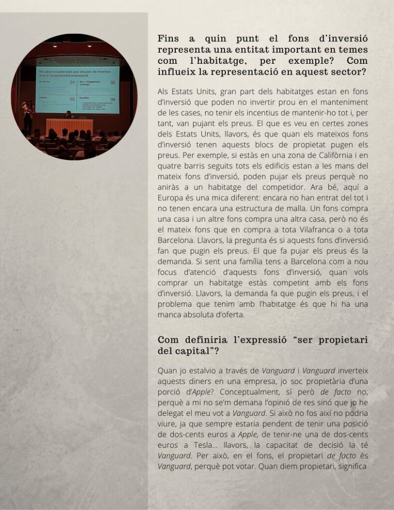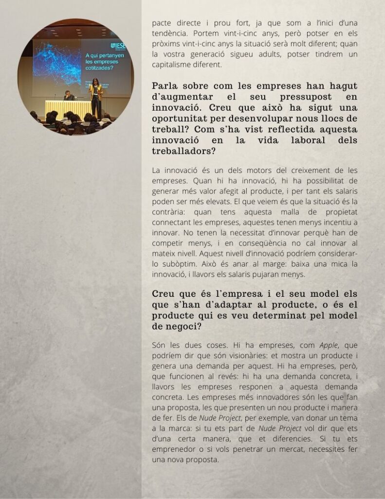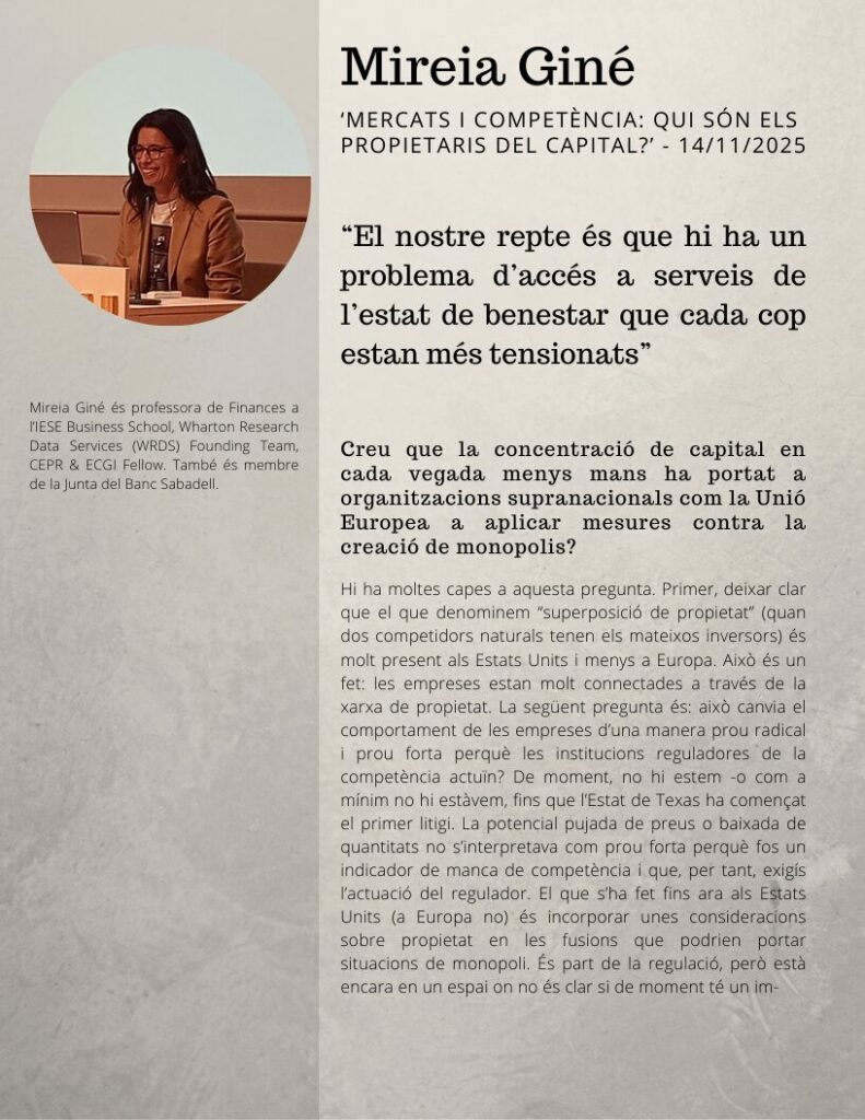 Oferim, a continuació, l’entrevista amb Mireia Giné, professora de Finances a l’IESE Business School. L’entrevista va tenir lloc després de la conferència que va oferir el passat 14 de novembre amb el títol “Mercats i competència: qui són els propietaris del capital?”.